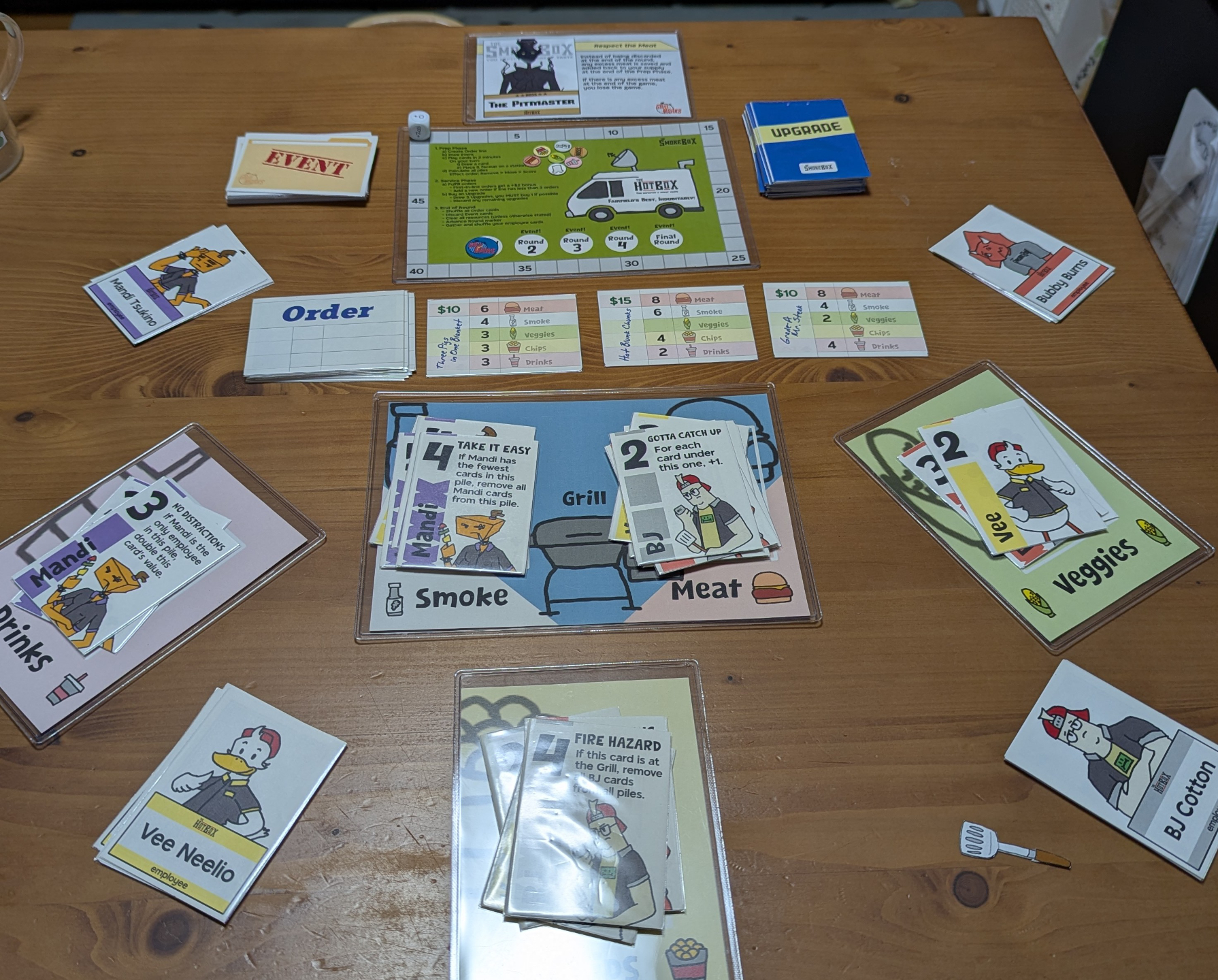 In this cooperative game for 1 to 4 players, you play as a team of employees running a new Smoke Box sponsored food truck called The Hot Box. Prep for service by quickly playing cards onto different stations to build up resources before time runs out. Use those resources to fulfill customer orders, and then spend some of that profit on upgrades. But watch out! Your Boss has strict rules for the team to follow; if you let them down, you're all fired!